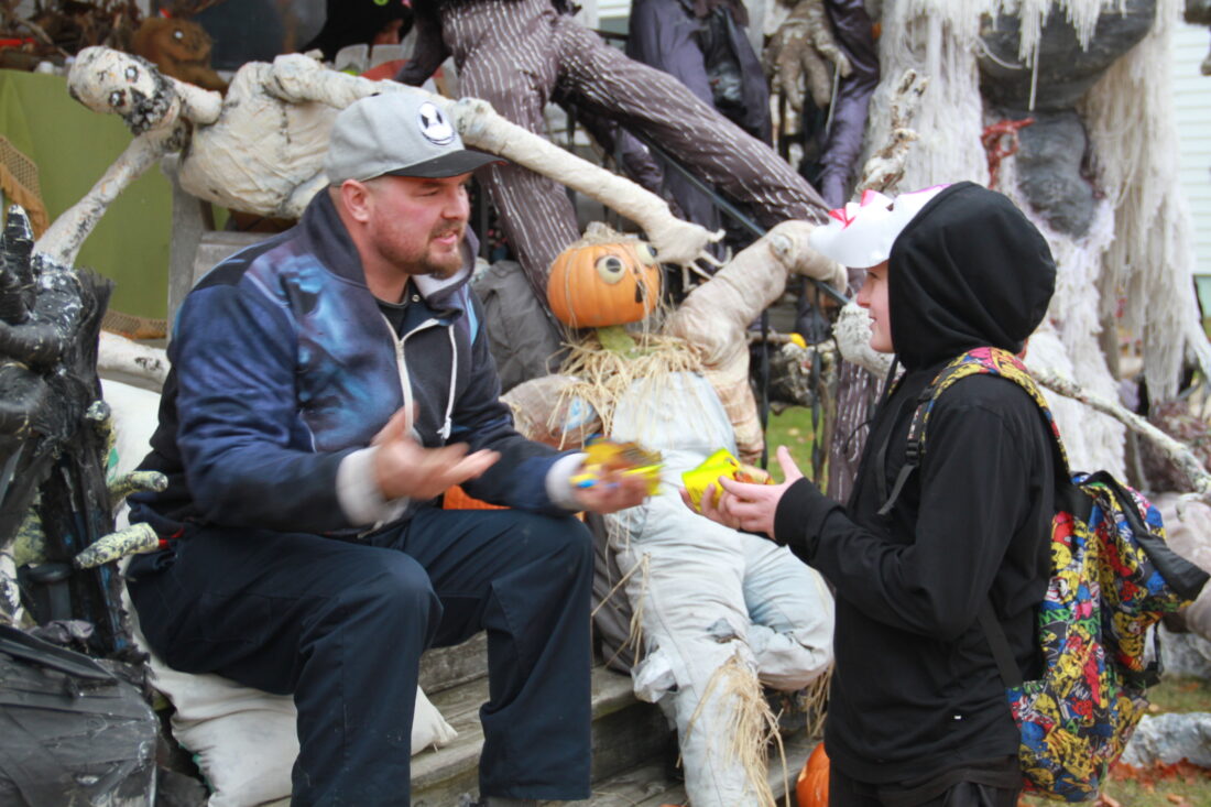A trick-or-treating interaction Friday on South Eighth Street in Escanaba. (R. R. Branstrom | Daily Press)