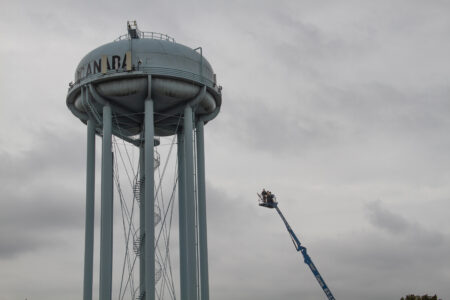 - Workers from Ray’s Welding, a subcontractor hired by Five Star Energy Services, reach the water tower near the Civic Center in Escanaba this autumn. Grant funds paid for the water tower improvements. (R. R. Branstrom | Daily Press)