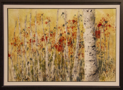 A: Birch trees are favorites of mine, as is fall. Fall leads to winter, my favorite season. The colors of fall leaves, the contrasting white birches inspire me to tell a story in the language of paints, of what moved me to capture the scene.