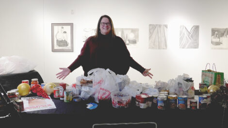 Amy Gibbs from the Bay College Food Pantry shows some of the donations from 2024 Day of Giving Concert event. (Photo provided by Bay College)