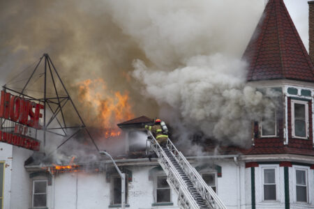 Firefighters work to put out the flames coming out of the House of Ludington in Escanaba Friday afternoon. (R. R. Branstrom | Daily Press)