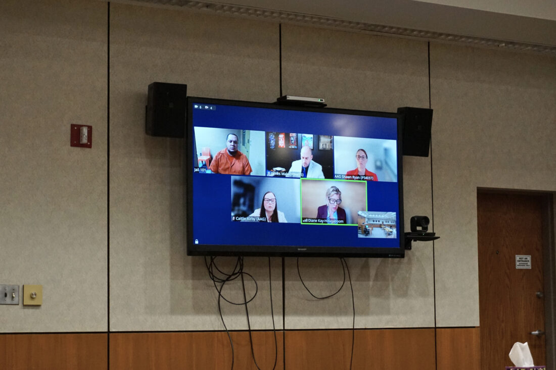 Tavaris Jackson, accused of open murder in the 2023 death of his pregnant ex-girlfriend Harley Corwin, appeared virtually Dec. 18 and Tuesday in the 47th Circuit Court of Delta County in Escanaba, along with his defense team, Diane Kay-Hougaboom and James Maki, and members of the Michigan Attorney General's office, Shawn Ryan and Caitlin Kirby. (Sophie Vogelmann | Daily Press)