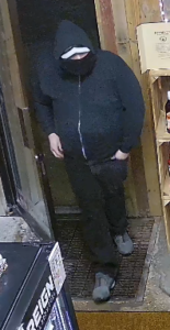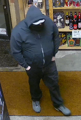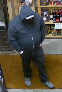 The male being sought is described as white, about 5 feet 7 inches to 5 feet 9 inches in height and weighing roughly 225 to 260 pounds. No other distinguishing features could be noted due to his face and hair being concealed by clothing — he had a jacket hood pulled over what appears to be a knit winter hat and a winter face cover. The male was wearing black pants, a navy-blue, zip-up light jacket and gray athletic shoes at the time of the incident.