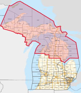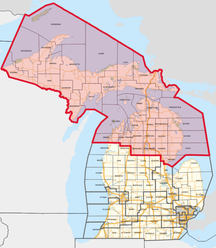 - A map shows Michigan’s First Congressional District, which includes all of the Upper Peninsula and a number of counties in the northern Lower Peninsula. (Contributed map)