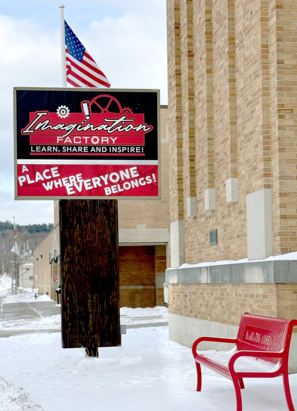 Imagination Factory Community Center of Iron Mountain will open the first floor of its children’s museum on Saturday, Feb. 28. An open house is slated for Saturday and Sunday, Feb. 7-8. The new outdoor signs, created by Bill Henricksen of Ink Design & Apparel, were recently installed. (Terri Castelaz/Daily News)
