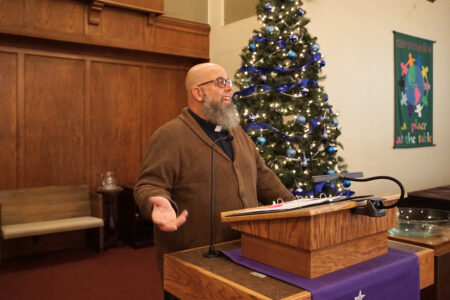 The Rev. Daniel Van Beek of the First Presbyterian Church in Escanaba speaks at the pulpit. Van Beek has been with the church since fall 2024. (Sophie Vogelmann | Daily Press)