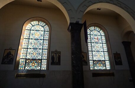 The stained glass windows in the St. Joseph & St. Patrick Parish Catholic church in Escanaba are each adorned with significant symbols, such as the fleur-de-lis, which is a lily flower associated with the Virgin Mary and purity. (Sophie Vogelmann | Daily Press)