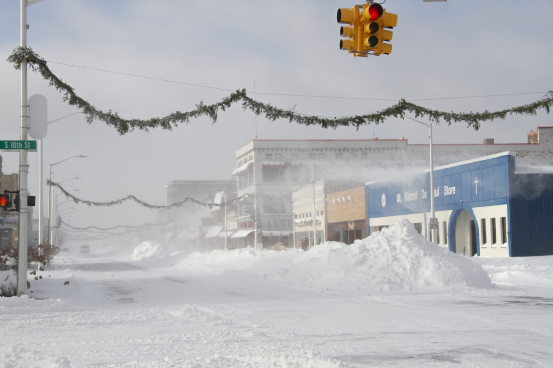 - Plowed snowbanks and gusting snow are seen in this view of Escanaba’s Ludington Street on Monday afternoon. (R. R. Branstrom | Daily Press)