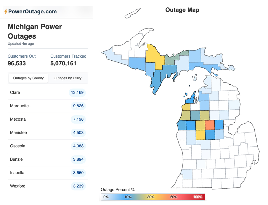 - Homes and businesses in the Upper Peninsula and the northwestern Lower Peninsula lost power from the storm that hit the area Sunday night into Monday. (Image from poweroutage.com)