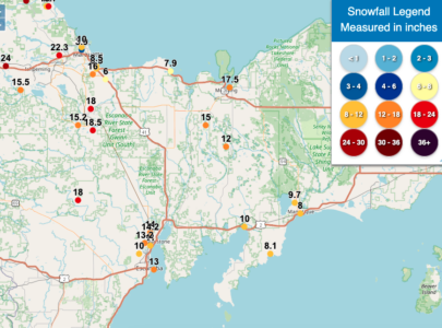 - This image on weather.gov shows reported snowfall amounts in the central Upper Peninsula. A range of recordings, even in the same towns, indicates the variation in depth caused by high winds.