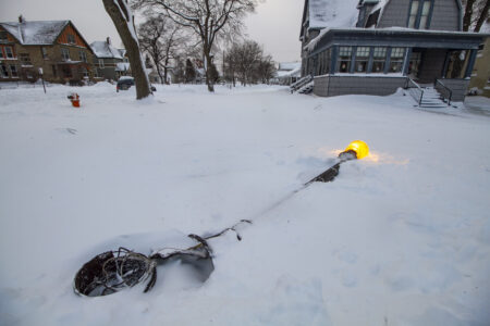 - On Monday, a downed but illuminated lightpost on South Seventh Street in Escanaba lies in the snow. (R. R. Branstrom | Daily Press)