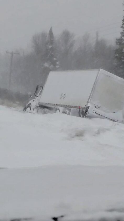 - Many vehicles needed to be towed after trying to travel in poor conditions Monday, including this truck in the ditch on M-35 near Rock. (Photo courtesy of Dave Pepin)