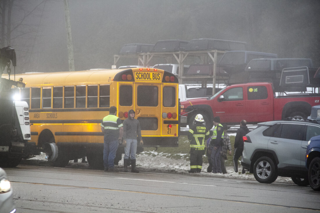 The report came in about 1:45 p.m. on U.S. 2 and 41 near the intersection with P Road. Preliminary investigation by MSP troopers “indicated that the passenger vehicle crossed the center line and side-swiped the school bus due to the driver suffering from a possible medical event,” a news release from MSP stated.