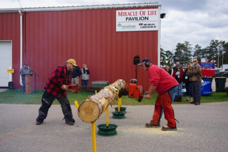 - Bear Wheeler of Elcho, Wis., left, and Bob Peterson of Green Lake, Wis., perform a “ribbon-cutting” on a log using a large, antique, two-person chainsaw during the Great Lakes Logging and Heavy Equipment Expo. The annual three-day event in early September celebrates and connects various professionals and other parties interested in the timber industry at the Upper Peninsula State Fairgrounds in Escanaba. (Sophie Vogelmann | Daily Press photo)