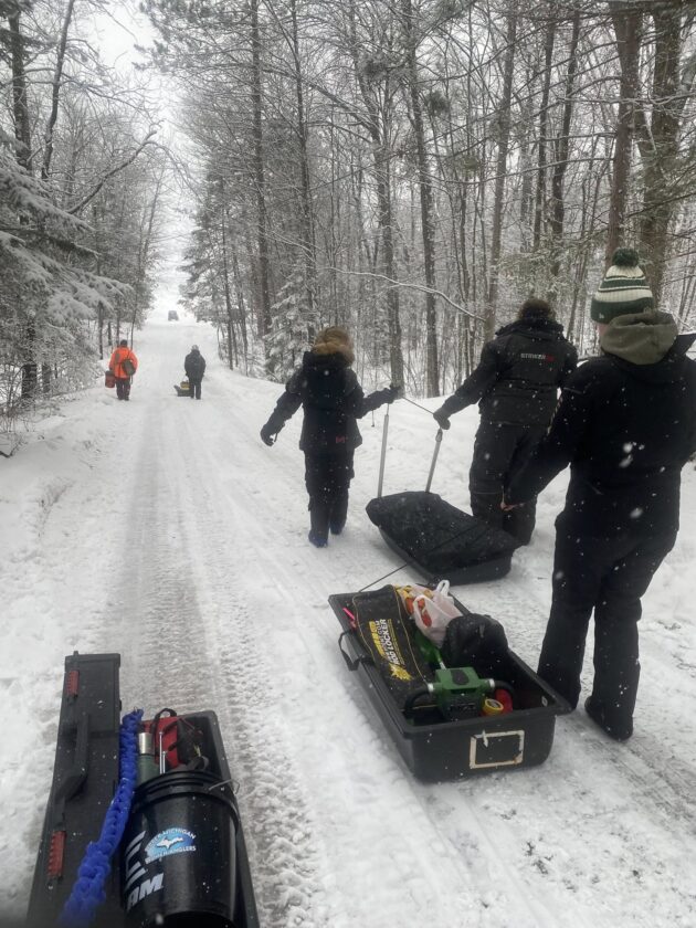 - Participants of the women’s ice fishing clinic that was held in Delta County this weekend head out from Vagabond Resort on Stonington Peninsula with their gear. (Photo courtesy of Lindsey Reynolds)
