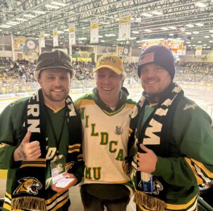 - Greg “Ponzie” Pond of Munising, center, poses with internet stars Joshua Cauldwell-Clarke, left, and Jason Riley, right. The visitors from England have been touring Michigan, and Pond got to meet them at a Northern Michigan University hockey game on Saturday. (Courtesy photo)