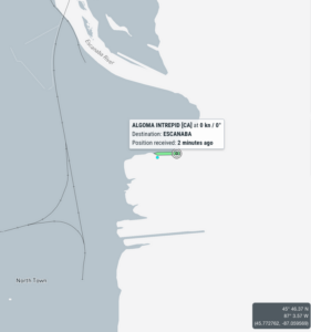 - The positions of the freighter Algoma Intrepid and icebreaking tug Jimmy L (represented by the dot near the bow of the big ship) are shown as they were in Escanaba at 12:45 p.m. on Jan. 23. (Screenshot from marinetraffic.com)