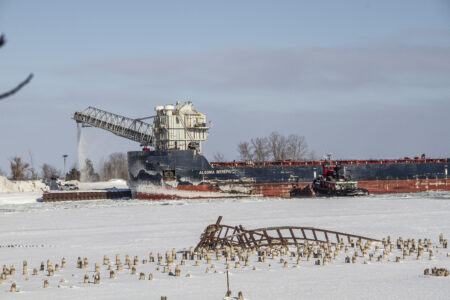 Rock salt spews from the self-unloading arm on the partially-ice-encrusted Algoma Intrepid at the C. Reiss Company dock in Escanaba on Jan. 23 while the icebreaking tug Jimmy L works at her side. In the foreground, the skeleton of a former dock recalls Escanaba's shipping history. (R. R. Branstrom | Daily Press)