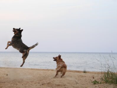 Australian cattle dogs Chong and Cheech play on the beach at O.B. Fuller Park and Campground, one of the recreational destinations managed by Delta County, where the board just approved a new plan. (R. R. Branstrom | Daily Press)