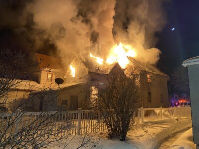 Upon EPSD’s arrival, visible flames were through the roof, fully-engulfing the upper story and then some. The local public safety department initiated an attack with ladder truck 35, the deluge gun off of fire engine 35, and two handlines, according to a press release issued that night.