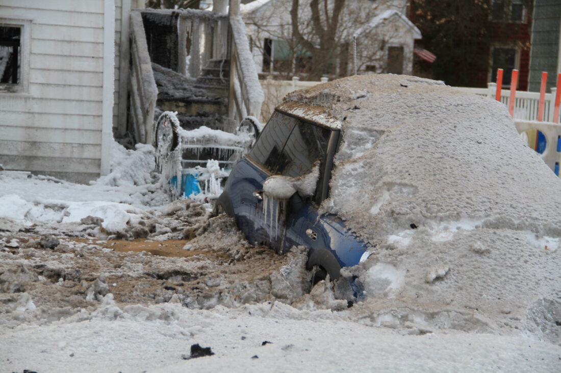 A Mini Cooper is covered in snow and ash behind a burned home on South Eighth Street. (R. R. Branstrom | Daily Press)