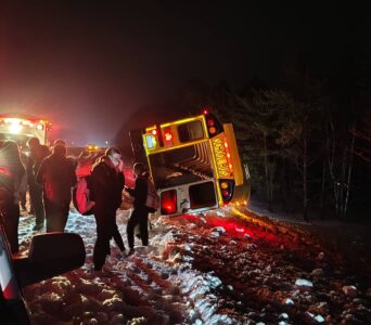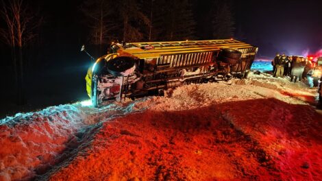 While southbound on Highway M-553 in Sands Township near the Marquette County Fairgrounds, the school bus lost control on the slick road. It slid, “crossed the centerline, then went off the roadway to the left and overturned onto its side in deep snow along the shoulder,” according to the Marquette County Sheriff’s Office, which was dispatched at 9:25 p.m.