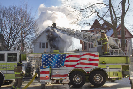 - On Friday morning, first responders from multiple Delta County agencies work to extinguish a house fire on Escanaba’s South Eighth Street. (R. R. Branstrom | Daily Press)