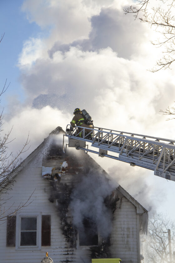 - Escanaba Public Safety’s Det. Lt. Tabitha Turnacliff is at the top of ladder truck 35 with a jet spraying the peak of a burning house.