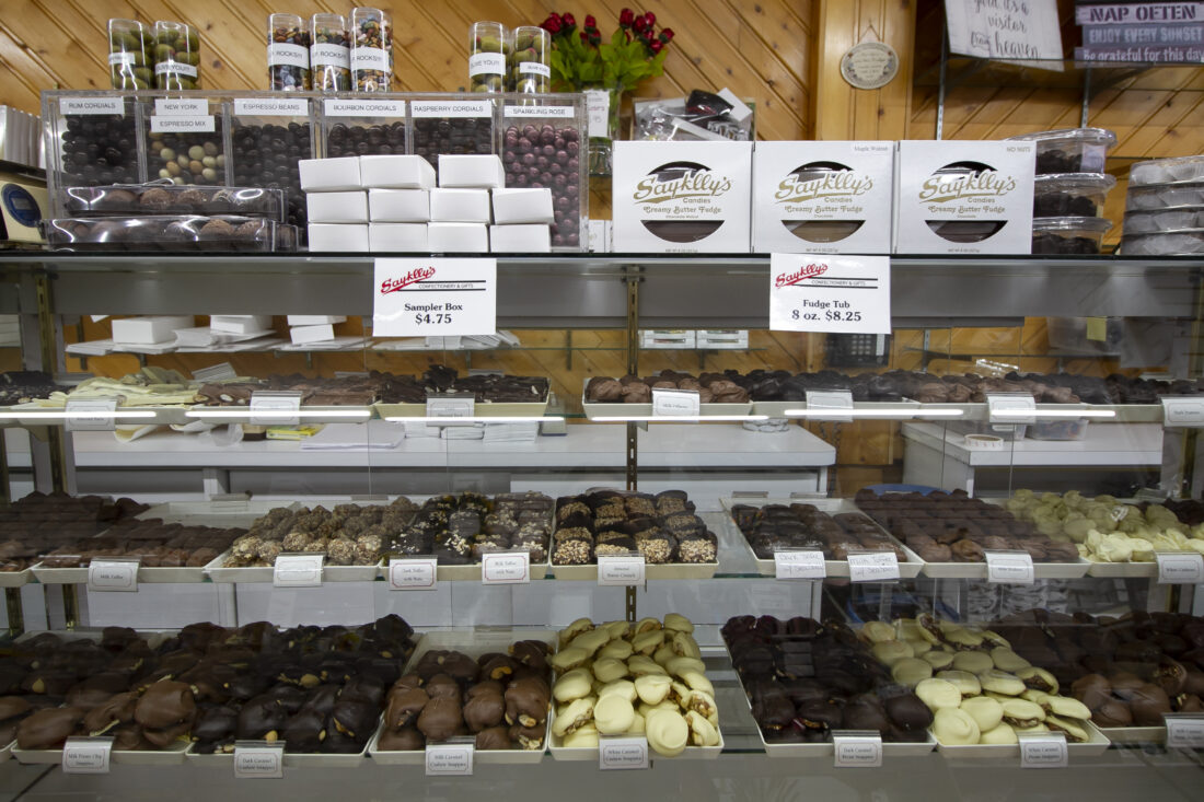 From wind chimes to pottery to Michigan-themed puzzles and Escanaba souvenirs, the retail store offers much more than chocolate — though of course the candy is a big draw. Favorites are pecan snappies, sea salt caramels, chocolate-covered “sea foam” (airy molasses), nut clusters and chocolate-covered sandwich cookies. They also carry big national brands in addition to Sayklly originals.