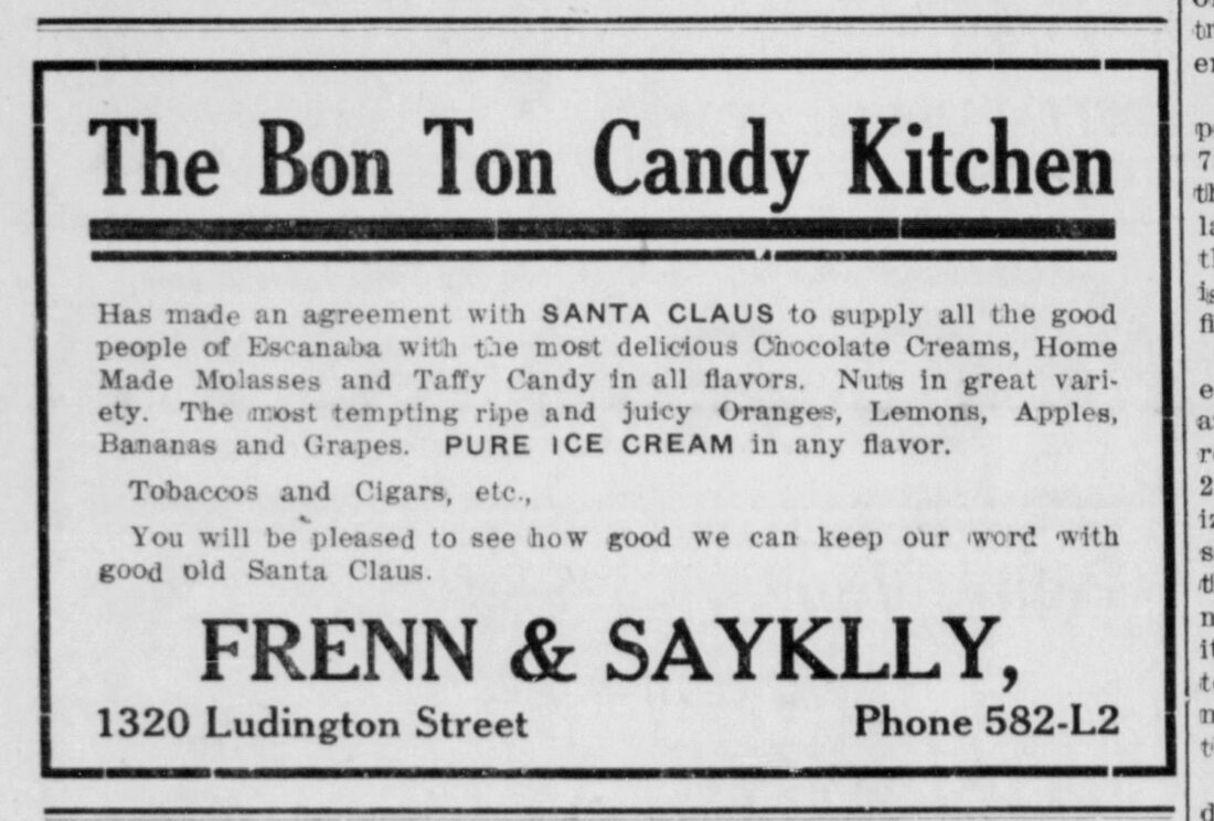 Sayklly went into business with Charles Frenn, also from Lebanon, and the firm of “Frenn & Sayklly” was selling candy as early as 1900, reports the National Register of Historic Places in its description of the Escanaba Central Historic District. The two began a store on the 300 block of Stephenson Avenue and operated more than one on Ludington Street.