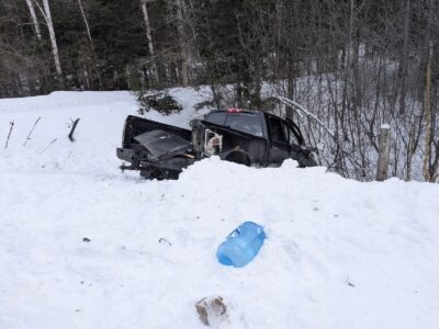 A pickup truck is seen in the ditch after it collided with a Canadian National train near Rapid River on Thursday. The train is seen in the background; it was moved down the tracks to clear the roadway for responders. (Courtesy photo)