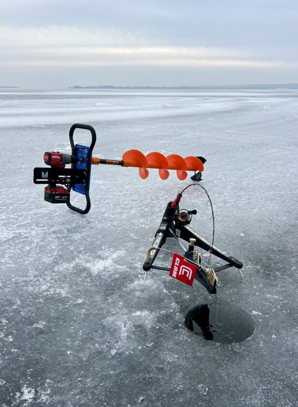 - Corie Berrigan, founder of Upper Michigan Women Anglers, prepares to drill through ice with an auger. (Photo courtesy of Corie Berrigan)
