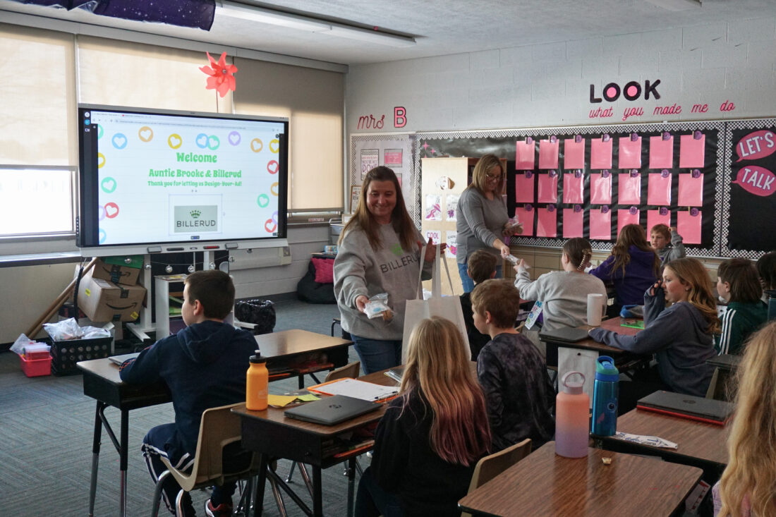 Several businesses are participating in the Daily Press’ Design an Ad contest, and Billerud’s Escanaba Mill is getting in on the fun. Heidi Berg, human resources generalist of the local mill, and Brooke Loman, executive administer at the mill, visited James T. Jones Elementary in Gladstone on Friday to inform students in Rebekka Bruce’s fourth-grade class about the contest and what their business is looking for in their art. Berg (left) and Loman (right) are pictured handing out gifts to students after the presentation. (Sophie Vogelmann | Daily Press)