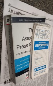 A journalist's notebook and trusty Associated Press Stylebook lie on an open Daily Press "Opinion" page. The local newspaper is seeking content from aspiring writers to be published in a series of columns that reveal what life is like for middle- and high-schoolers.
