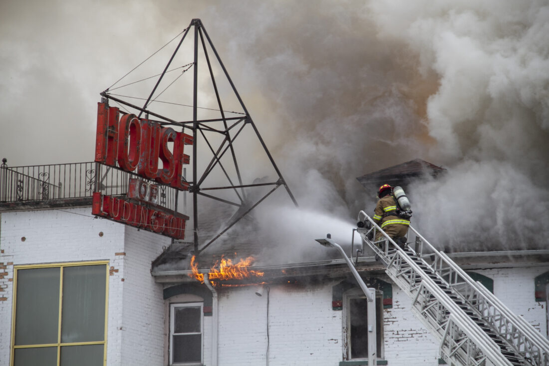 - Late Friday morning, a firefighter from the Escanaba Public Safety Department gets close to the action from a ladder truck as the House of Ludington burns. (R. R. Branstrom | Daily Press)