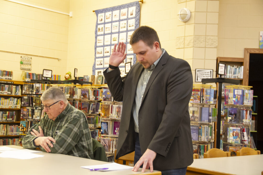 - Joseph Huber takes an oath and is sworn is an a trustee of the Gladstone Area Schools Board of Education on Monday. (R. R. Branstrom | Daily Press)