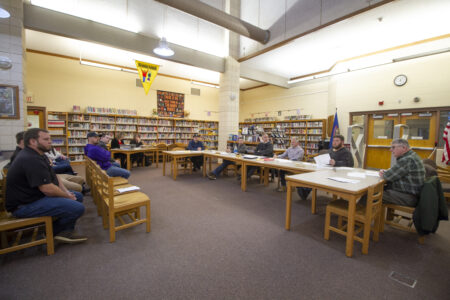 At the school board meeting held at the Gladstone Public Library on Monday are, from right, Henry Knoch, Nathan Neumeier, Superintendent Jay Kulbertis, Jesse Seger, Phil DeMay, school staff and administration as well as applicants for a school board position and one additional parent. (R. R. Branstrom | Daily Press)