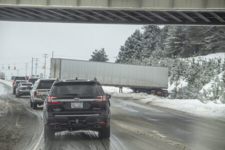 Around or before 11:30 a.m., while travelling southbound on U.S. 2 and 41, just after passing under the Canadian National railroad bridge near the Tom Casperson Memorial Bridge which crosses the Escanaba River, the semi lost control in the slush and slid to the right, its cab taking out a sign on the side of the road and the trailer stretching from the ditch across the lanes of traffic — but still right-side-up.