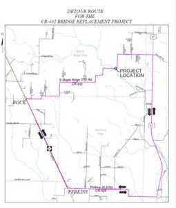 MAPLE RIDGE TOWNSHIP — A five-month bridge reconstruction on the Osier-Rock cut-across — County Road 432, otherwise known as East Maple Ridge 37th Road — will make the portion over the Elm Creek branch of the Rapid River inaccessible to traffic. The suggested detour is 30 miles long.