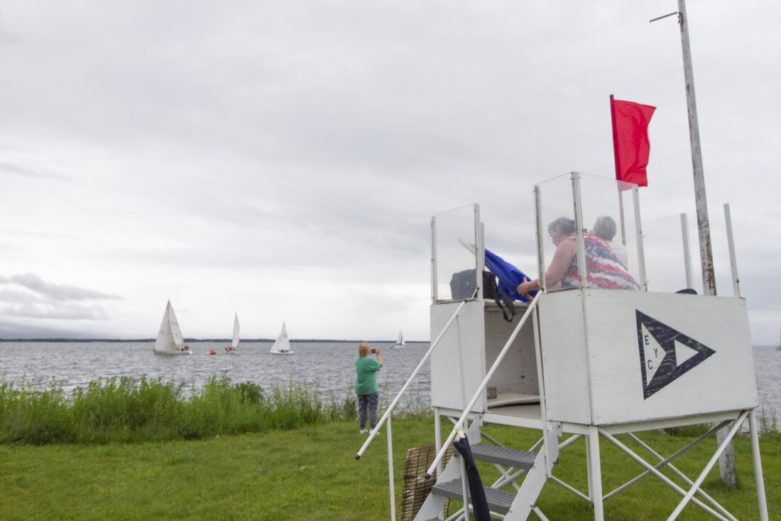 From Sand Point on a Wednesday evening in June 2024, spectators watch a sailboat race coordinated by the Escanaba Yacht Club while the race committee uses flags to signal the start. (R. R. Branstrom | Daily Press)
