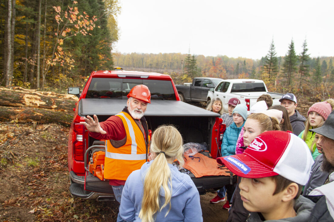 Rick Desellier, safety training specialist and loss control representative for Michigan Association of Timbermen Self-Insurers' Fund (MATSIF) speaks to high school students during a field trip to a live logging site in October 2023. Desellier is scheduled to give a presentation on jobsite and chainsaw safety at the Great Lakes Timber Professionals Association's Spring Celebration at the Island Resort and Casino on April 1. (Daily Press file photo by R. R. Branstrom)