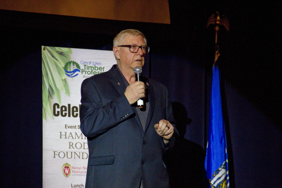 - Executive Director Henry Schienebeck speaks at a Great Lakes Timber Professionals Association Spring Celebration at the casino in Harris in 2024. The event returns in a couple weeks. (File photo by R. R. Branstrom)