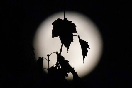 A blue full moon rises behind the leaves of a Trident Maple Tree in Lawrence, Kan., Saturday, Oct. 31, 2020. (AP Photo/Orlin Wagner)