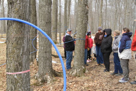 People tour the woods at the Michigan State University Extension Forestry Innovation Center in Hyde, Mich., during “Maple Weekend” in April 2025. The 2026 event is going on now. Jesse Randall, director of this same location, is working with researchers across the country to study the health benefits of maple sap. (R. R. Branstrom | Daily Press)