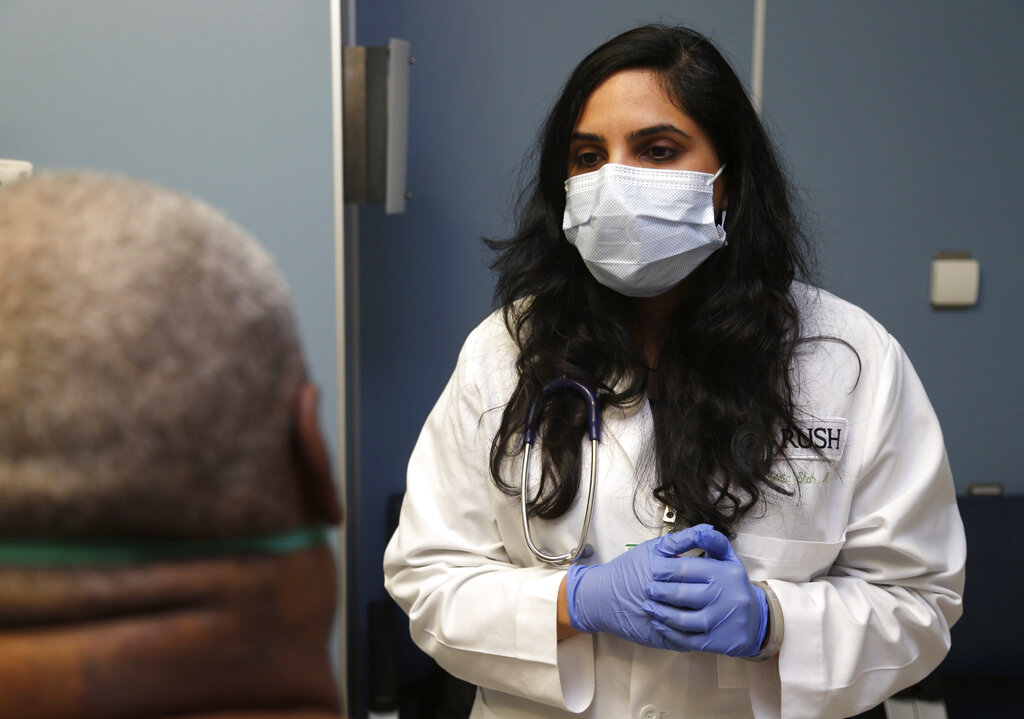 Dr. Meeta Khan wears a face mask as she sees a respiratory patient at the Rush University Hospital emergency department in Chicago. Though it's been a moderately severe year with still a high number of cases, flu season often drops off at the end of March. (AP Photo/Charles Rex Arbogast)