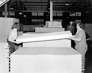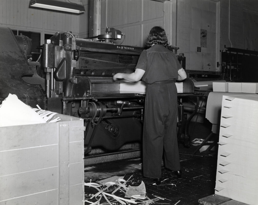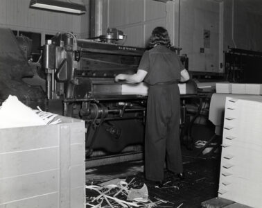 One of these women was my mother, Beda LaFave/Thinglum, who worked in the sheeting and finishing department. They were responsible for cutting large rolls of paper into sheets and hand-wrapping them for shipment.