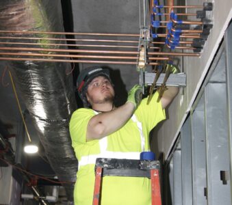 Brandon Waldrop of Plumbers and Pipe Fitters Local 111, while employed by Hurckman Mechanical Industries, sets pipe at the Bay Mills Casino Resort Expansion project last year. Waldrop was recently named Apprentice of the Year for 2025. (Photo by Jack Deo | The Building Tradesman)