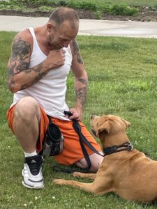 Incarcerated people at Alger Correctional Facility are given the opportunity to train dogs from the Delta Animal Shelter in the Dawgz Adapt program. Brian, an incarcerated handler at the facility, kneels next to Oakley during training. (Courtesy photo)