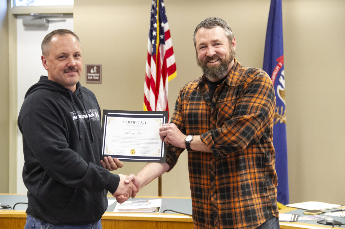 - Adam Fix, left, of the Escanaba Public Works Department accepts a certificate recognizing the department’s hard work this winter from Mayor Mark Ammel. (R. R. Branstrom | Daily Press)