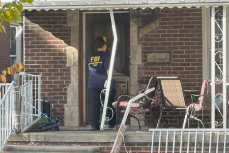 FBI agents gather Friday outside a home in a Dearborn, Mich., neighborhood. (AP Photo/Mike Householder)